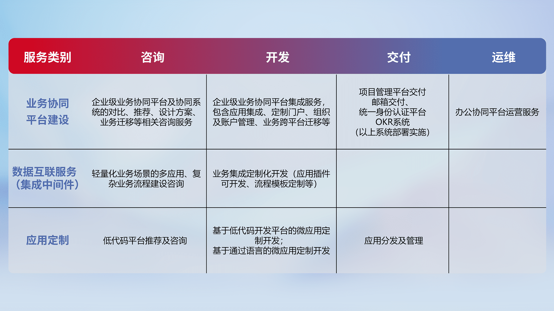 针对钉钉、、企微、、、、IDaas等平台级产品提供产品的规划、、、方案、、交付、、、、定制化开发等服务,,,,实现如统一协同办公、、、、智能客户服务、、、混合会议管理、、智能数据查询、、、、等业务场景,,,实现数字化转型。。